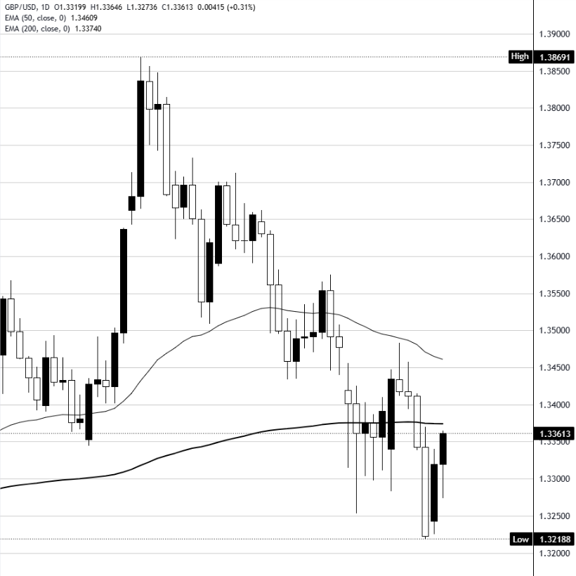 英镑/美元周二上涨约0.3%,连续第二个交易日上涨,交易价格在1.3360左右。该货币对在上周晚些时候跌至接近1.3220的三个月低点后,在1.3250至1.3300之间找到了支撑,尽管仍低于其关键的日均移动平均线。两天的反弹产生了两个温和看涨的K线,但价格仍处于1月下旬接近1.3870高点以来的更广泛抛售区间内。