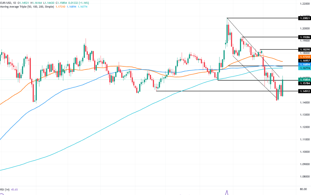 欧元兑美元从接近1.1440的低位反弹后,上涨1.16%至1.1582。