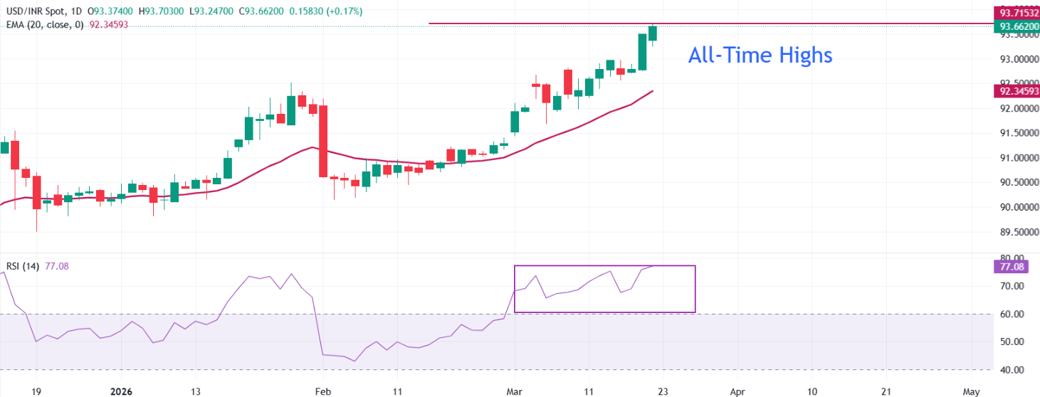 在前一日休市后,印度卢比(INR)在周五开盘交易中对美元(USD)的跌势延续。该美元/卢比货币对升至接近93.70的水平,因印度货币持续面临来自印度股市持续的外资流出、中东冲突导致的油价上涨,以及美元的强劲反弹带来的巨大压力。