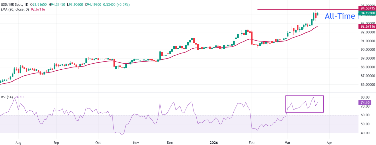 截至发稿时,USD/INR交易价格在94.15附近走高。由于价格突破上行的20日指数移动平均线(EMA),短期趋势看涨,确认了短期上涨行情。