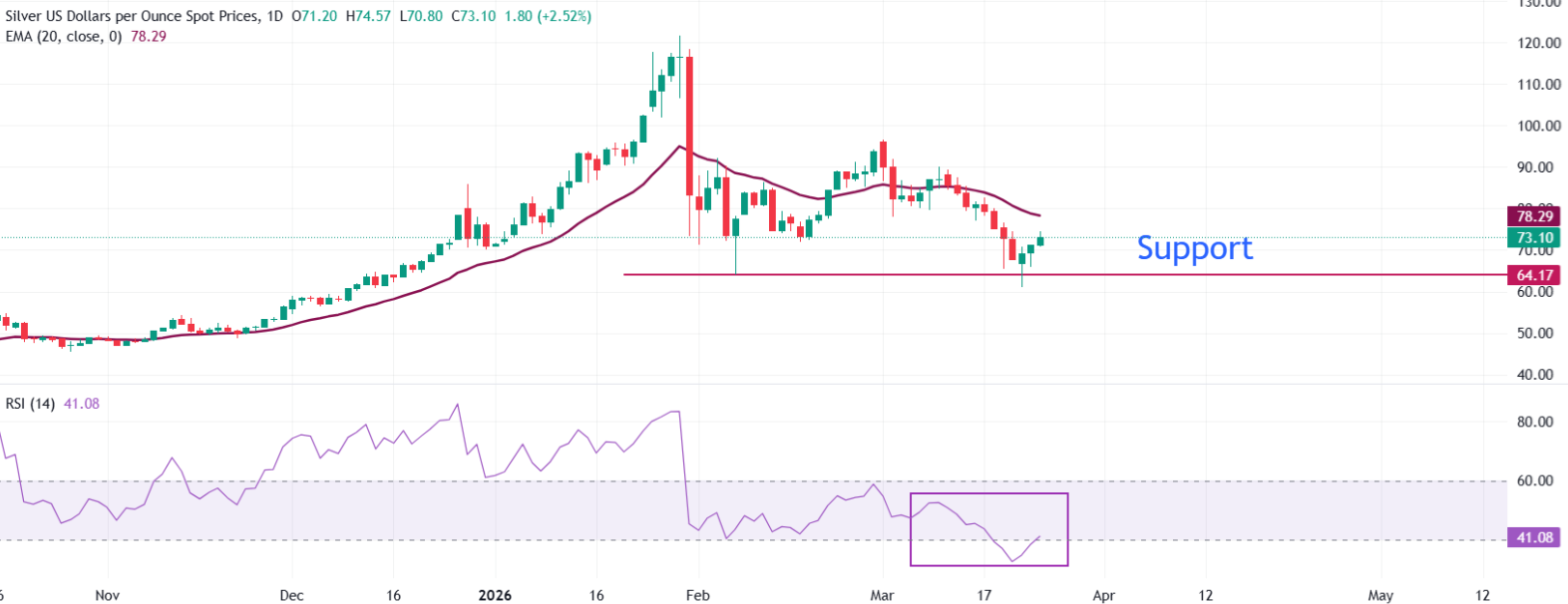 XAG/USD 在约 73.10 美元处走高。然而,短期趋势偏向看跌,因价格仍远低于 20 日指数移动平均线(EMA)附近的 78.30 美元,这在 96.62 美元峰值之后维持了近期的高点不断下移的格局。