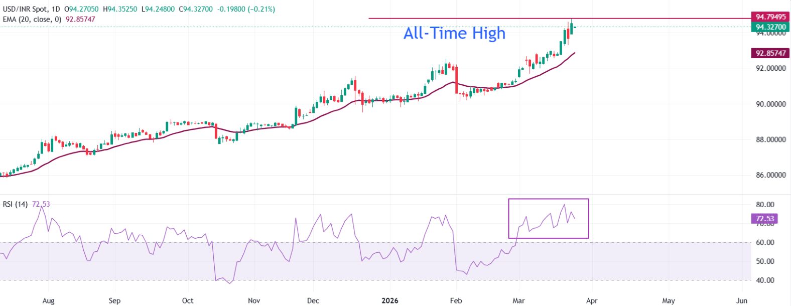 截至发稿时,美元/卢比(USD/INR)交投于94.30附近,小幅走低。然而,短期趋势偏向看涨,因价格维持在上升的20日指数移动平均线(EMA)上方的强劲上行趋势中,该均线目前位于约92.85。近期从94.50区域的回调并未破坏整体升势,因该货币对继续坚守短期趋势支撑位,并交投于此前92.50–93.00区间上方。