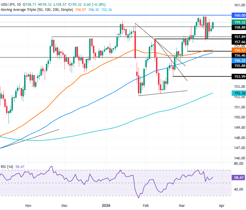 下行方面,首个关注区域是位于 158.24 的 20 日均线。一旦跌破,将为挑战 3 月 19 日的日低 157.51 开启大门,届时 50 日均线(约 156.56)将成为多头的下一个关键防线。
