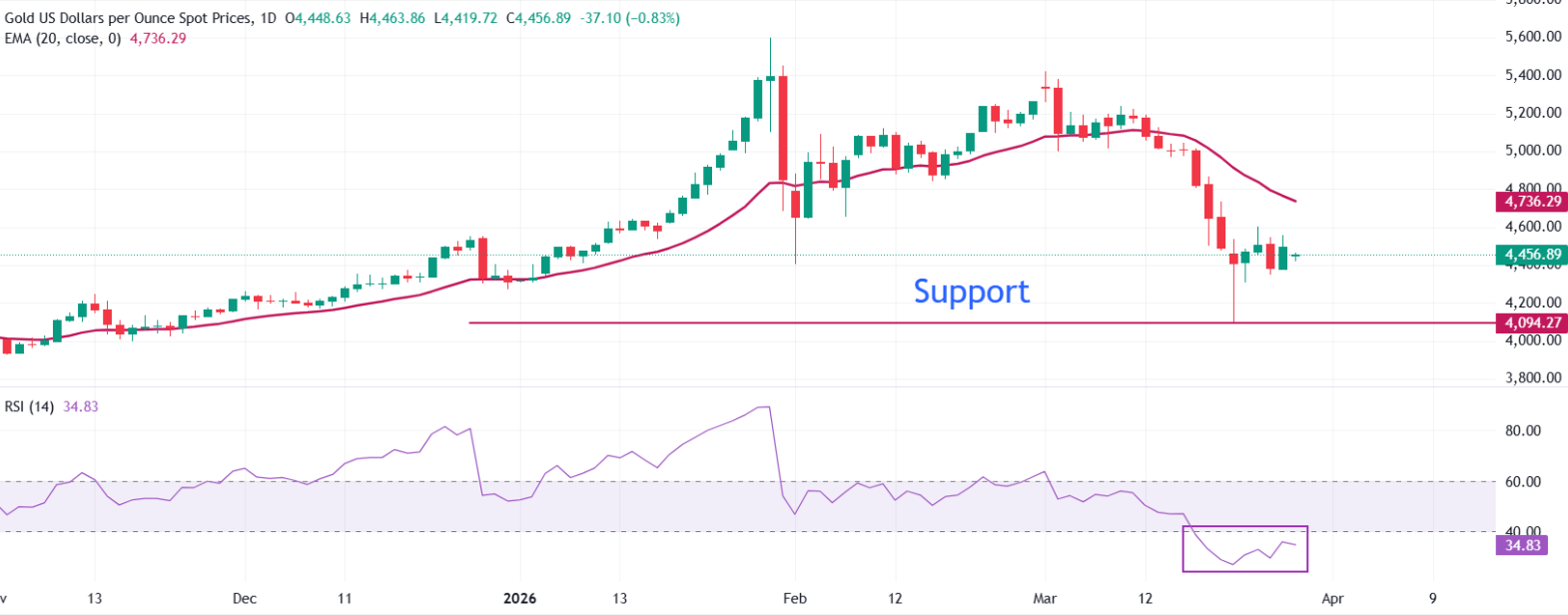 即时阻力出现在4736美元,此处20日均线与近期跌破参考位交汇,若出现修正性反弹,4915美元将是下一个上行阻力位。若日线收盘价回升至4915美元上方,将削弱当前的看跌结构,并打开通往5080美元的路径。下行方面,初步支撑位于3月24日低点附近4307美元,若跌破该位,将暴露下一个看跌目标,即3月23日低点附近的4100美元。只要价格保持在4736-4915美元阻力带下方,卖方将维持短期主导地位的前景。