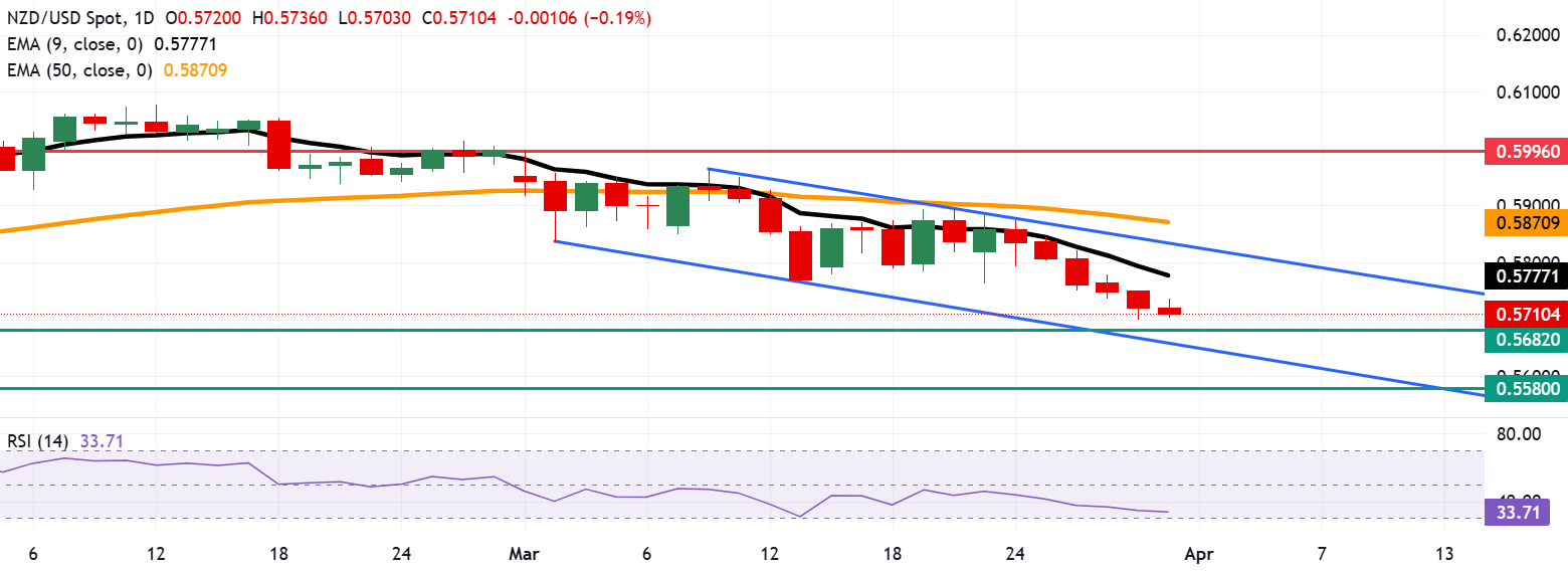 纽元兑美元连续第六个交易日下跌,在周二欧洲时段交易于0.5710附近。日线图技术分析显示,该货币对在下行通道模式内走低,暗示持续的看跌倾向。