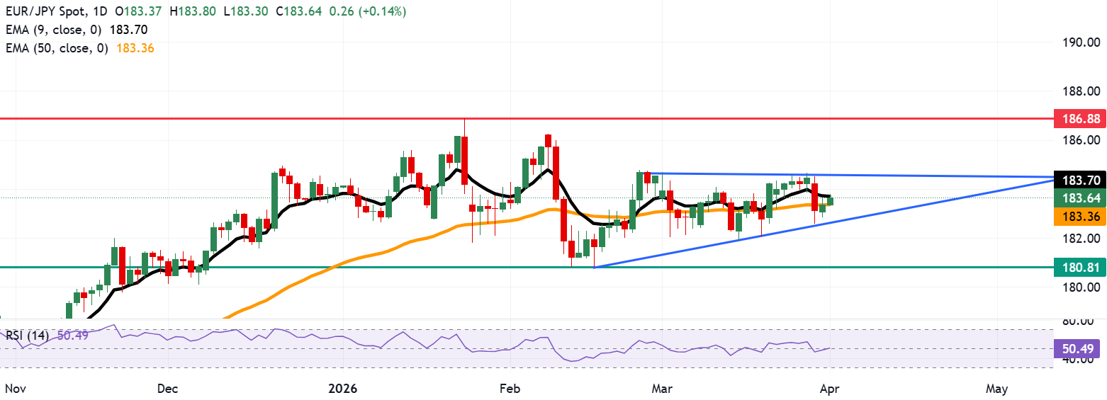 欧元/日元连续第二个交易日上涨,周三亚洲时段交投于183.60附近。日线图技术分析显示,该货币对在上升三角形形态内横向波动,反映出买盘压力。