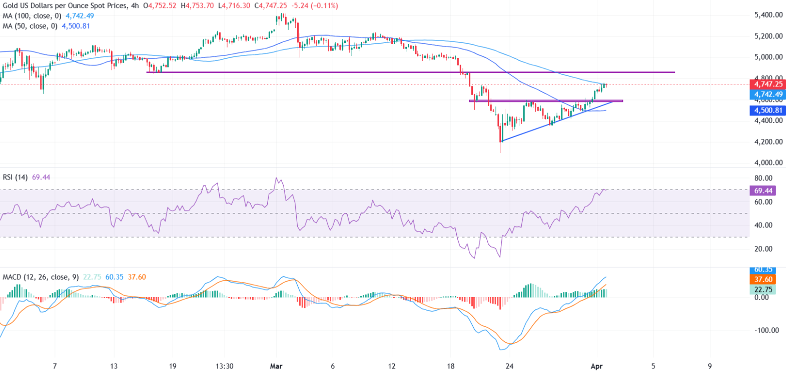从技术面来看,XAU/USD在4小时图上突破50周期简单移动平均线(SMA)并突破上升三角形形态后正在积聚动能。价格目前正测试位于4746美元附近的100周期SMA,该位置正充当即时阻力位。