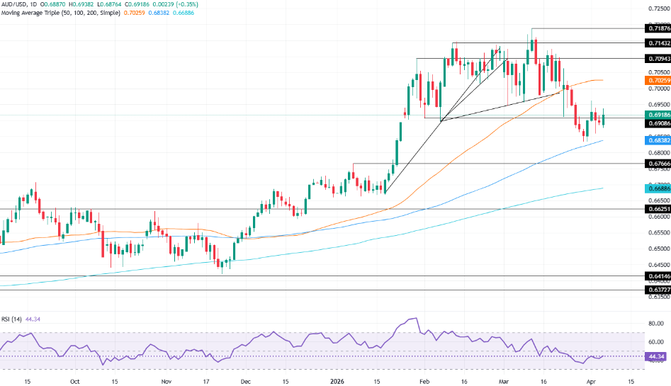 在日线图上,澳元/美元交易于0.6919。近期走势略偏看涨,因现价保持在支撑上涨趋势的密集支撑线之上,这些支撑线支撑着汇价从0.67区域的反弹;同时,价格也位于0.70附近的密集简单移动平均线上方,这些均线目前落后于汇价走势,进一步强化了整体的上行趋势。RSI指标位于44,虽仍低于中线,但在此前下跌后已企稳,表明下行动能正在减弱,而非出现明确的看跌压力,这与日线图上仍偏积极的修正阶段相一致。
