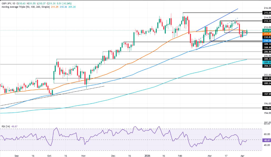 技术面显示,除非多头突破211.50这一心理关口(该水平被视为关键阻力位,突破后将为测试更高价位扫清道路),否则英镑/日元料将维持横盘整理。该货币对随后测试了上述水平,若能突破该水平,将为挑战20日均线211.90铺平道路,随后是212.00。若进一步走强,买方将瞄准3月26日高点213.31,随后是214.00。