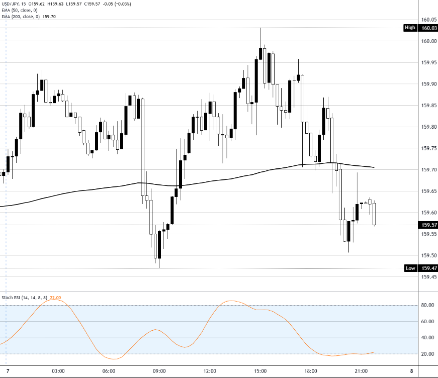 在15分钟图上,美元/日元交易于159.57。短期走势略偏空,因价格跌破当日开盘区间,并逐渐逼近200周期指数移动平均线,该均线在159.70附近趋于平缓,上行影响力减弱。该货币对正在形成更低的日内高点,而随机RSI指标仍被压制在区间下四分之一位置,表明上行动能疲弱,更倾向于对即时支撑位施加持续压力,而非出现持续反弹。