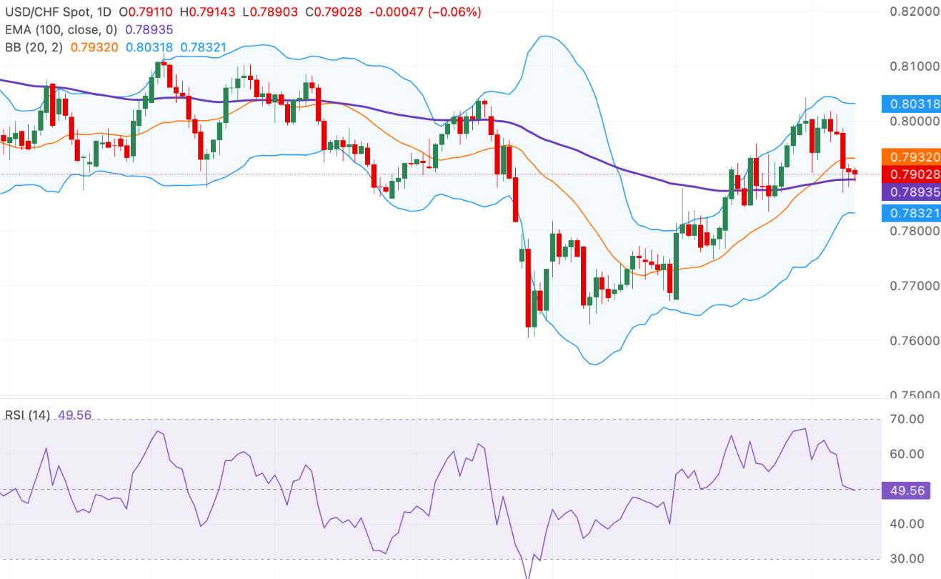 在日线图上,美元/瑞郎徘徊在100日指数移动平均线(EMA)0.7893上方,该位置提供附近支撑,但其仍受布林带20日简单移动平均线(约0.7932)压制,令整体走势保持中性且区间震荡。相对强弱指数(RSI)为49,基本持平,暗示在近期从高位回落之后,市场方向性动能不足。