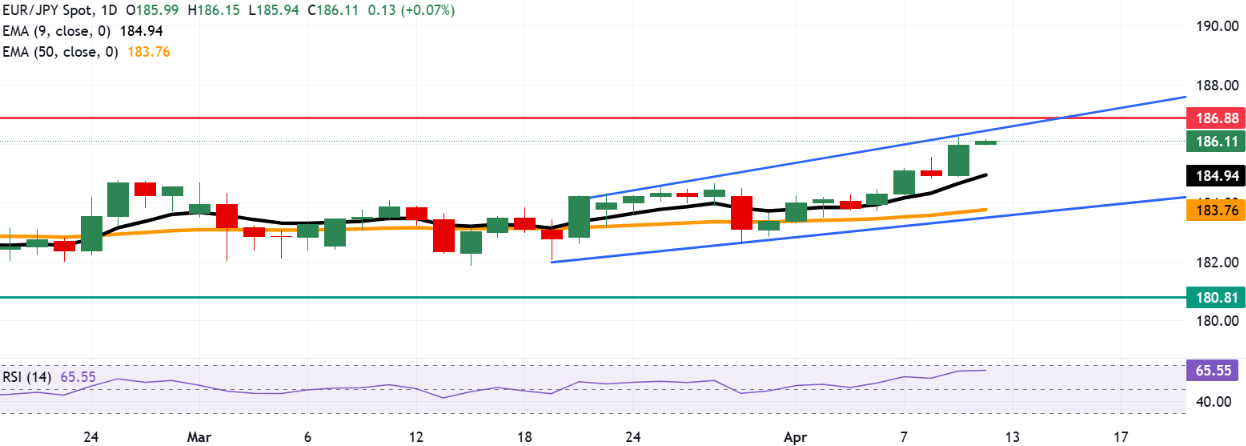 欧元兑日元连续第二个交易日上涨,周五亚洲时段交投于186.10附近。日线图技术分析显示,该货币对在上升通道内走高,表明持续看涨。