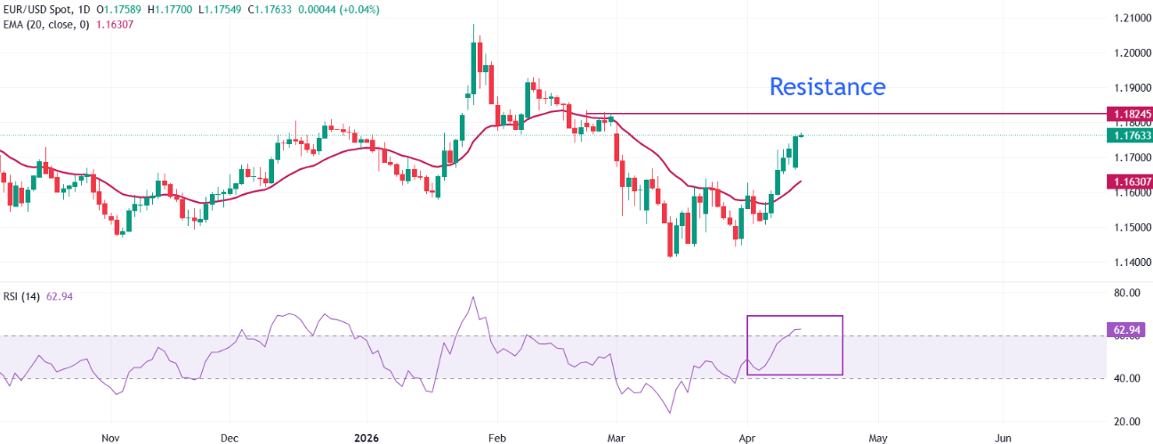 欧元/美元货币对周二欧洲早盘时段在1.1760附近交投,为六周以来的最高水平。该主要货币对走强,反映出市场情绪因美国(US)与伊朗之间永久停火的乐观预期而保持风险偏好。