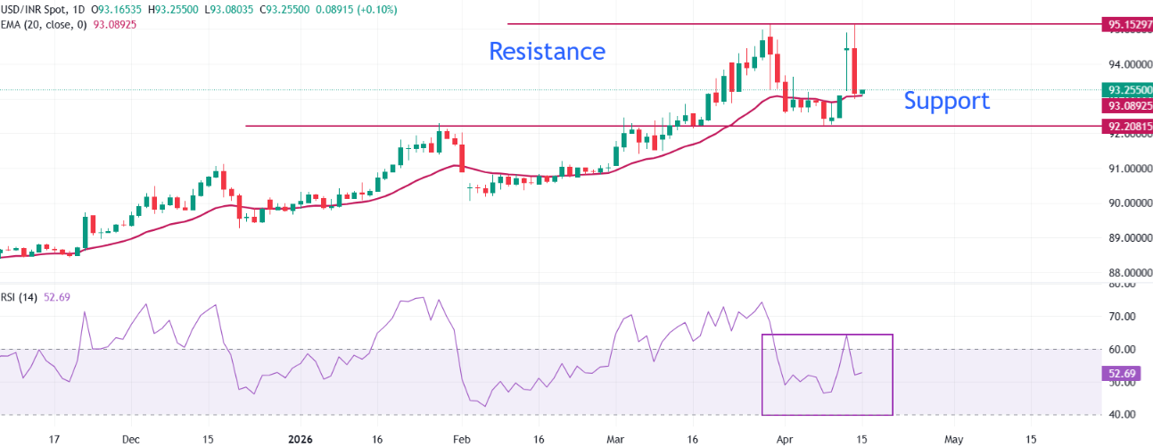 印度卢比(INR)在周三上涨,此前因庆祝巴巴·萨希布·安贝德卡尔诞辰而休市一天。美元/印度卢比货币对跌至接近93.20的水平,原因是油价大幅下跌,以及市场情绪乐观,人们越来越期待美国和伊朗可能很快达成永久停火协议,这提升了印度卢比的吸引力。