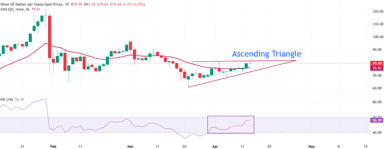 在接近81.00美元时遭遇卖压后,XAG/USD在79.50美元附近交投疲软。由于现货价格保持在20日指数移动平均线(EMA)75.91美元上方,近期走势仍看涨。从整体趋势来看,白银价格在日线图上处于上升三角形形态内,走势呈现中性。