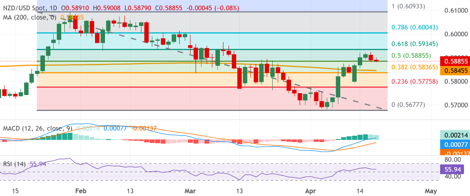 因此,任何进一步的下跌都可能在0.5885附近的50%回撤位获得即时支撑,随后是位于0.5845的200日移动平均线和位于0.5836的38.2%斐波那契水平位。只有当这些附近的支撑位失守时,才会关注向0.5776和0.5678摆动低点的更深度回调。