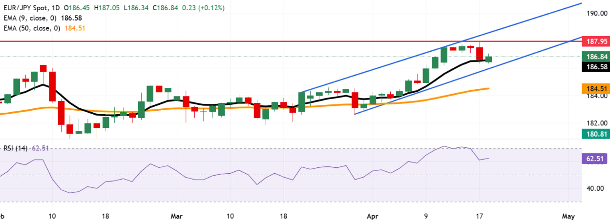 EUR/JPY货币对可能在心理价位187.00处遇到初步阻力,随后是4月17日创下的历史高点187.95。若进一步上涨,将支持该货币对测试位于188.60附近的上升通道上轨。