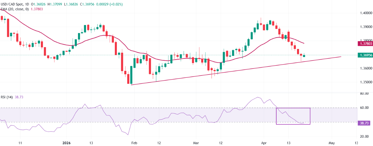 截至发稿时,美元兑加元交易价格小幅上涨,徘徊在1.3700附近。该货币对仍保持在20日指数移动平均线(EMA)1.3780下方,短期走势仍偏空。