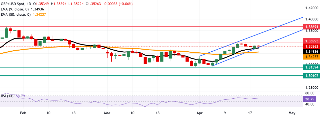 英镑兑美元在前一日录得小幅上涨后小幅走低,周二亚洲时段交投于1.3520附近。日线图技术分析显示看涨倾向仍在持续,因该货币对在上升通道模式内运行。
