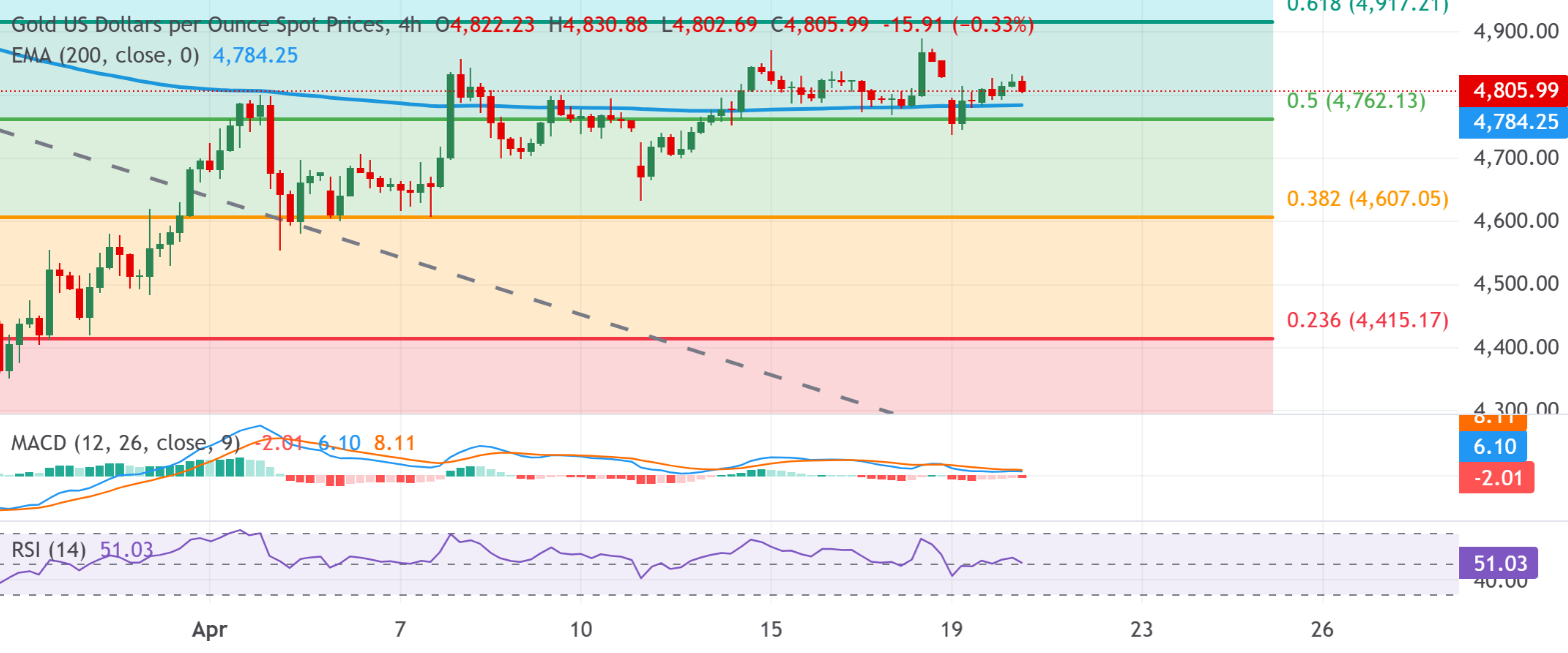 这种贵金属因位于200周期指数移动平均线(EMA)4784.25美元上方,近期走势偏向建设性。3月份下跌行情的50.0%回撤位4762.13美元,在EMA下方形成了第二层潜在需求支撑。与此同时,动能指标表现平淡而非具有方向性,相对强弱指数(RSI)徘徊在中性水平51附近,移动平均收敛散度(MACD)指标略为偏空。这暗示多头仍掌握结构性主导权,但目前缺乏强劲的后续跟进动力。