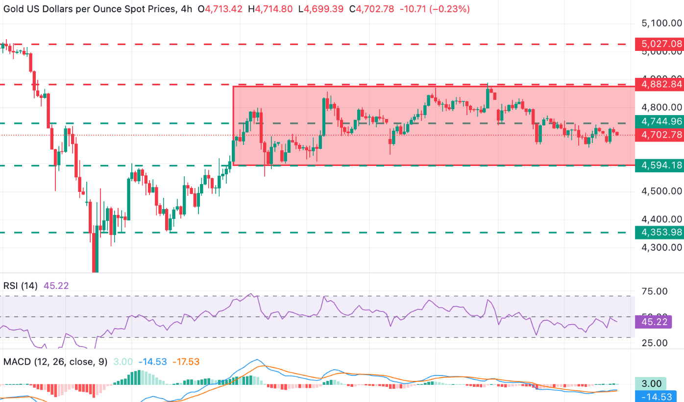 技术图表显示,XAU/USD 在一个更宽的水平通道内窄幅波动,关键支撑位在 4600 美元区域。