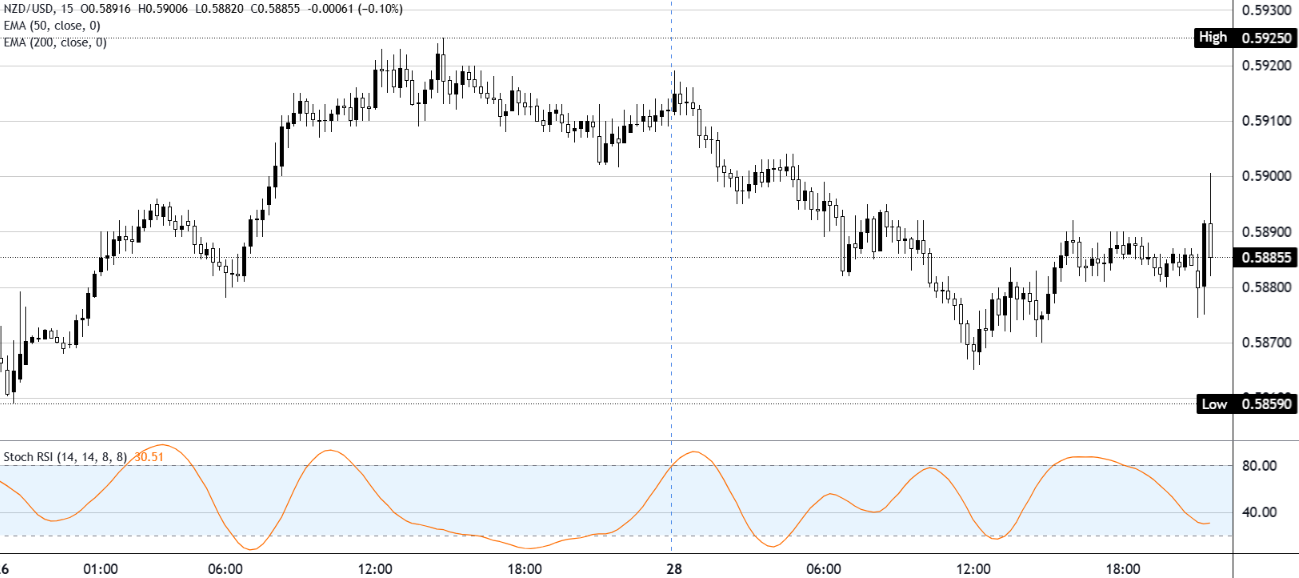 在15分钟图表中,纽元兑美元交易于0.5885,由于该货币对保持在0.5915的每日开盘价下方,日内情绪依然看跌。由于价格无法恢复到更高的参考水平,短期走势仍然受到限制,而随机RSI指标在44左右的中位附近缓解,表明在之前的超买读数后,多头动力正在减弱。