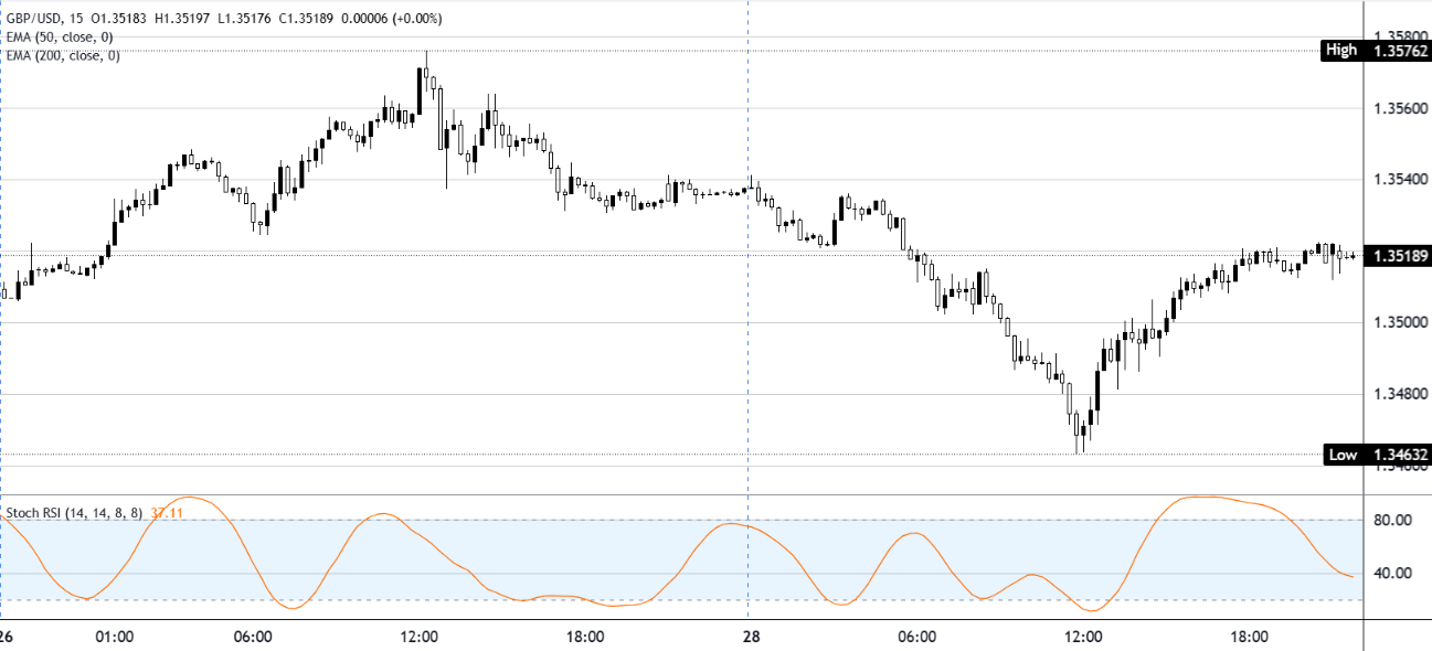 在15分钟图上,GBP/USD报1.3519,日内保持在1.3538的开盘价下方,目前该价格作为即时阻力位。最新的Stochastic RSI读数已回到其范围的下半部分,表明之前的超买状况已经缓解,尽管价格仍在开盘水平以下受限。