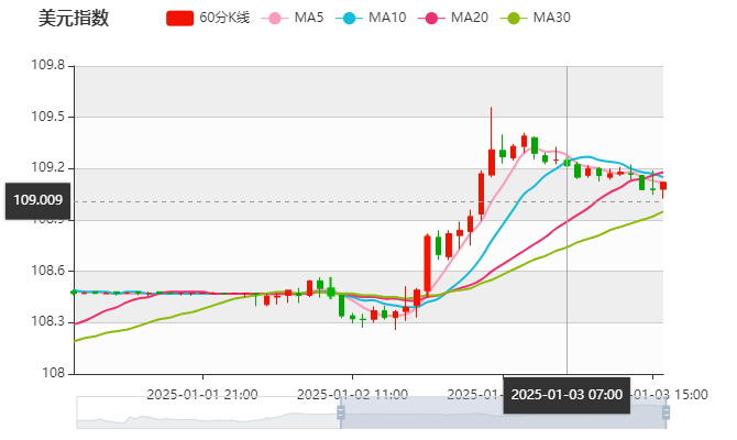 周五(1月3日)亚盘早盘,美元指数最新价报109.21,跌幅0.03%,开盘价为109.26。尽管美联储2024年将其关键借贷利率下调了100个基点至4.25%-4.50%,美元表现仍然强劲,今日再创新高,突破109关口并稳定于上方。