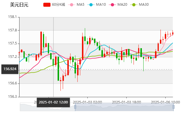 周一(1月6日)亚盘早盘,美元兑日元上涨,目前交投于157附近,截止北京时间10:57分,美元兑日元报价157.72,上涨0.29%,上一交易日美元兑日元收盘为157.27。数据显示:日本首都的核心通胀率在12月加速上升,而服务业通胀率则保持稳定,这使得市场对日本央行近期加息的预期依然存在。