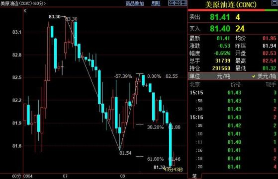 北京时间15:17,NYMEX原油期货下跌0.63%至81.42美元/桶;ICE布伦特原油期货下跌0.70%至84.74美元/桶。