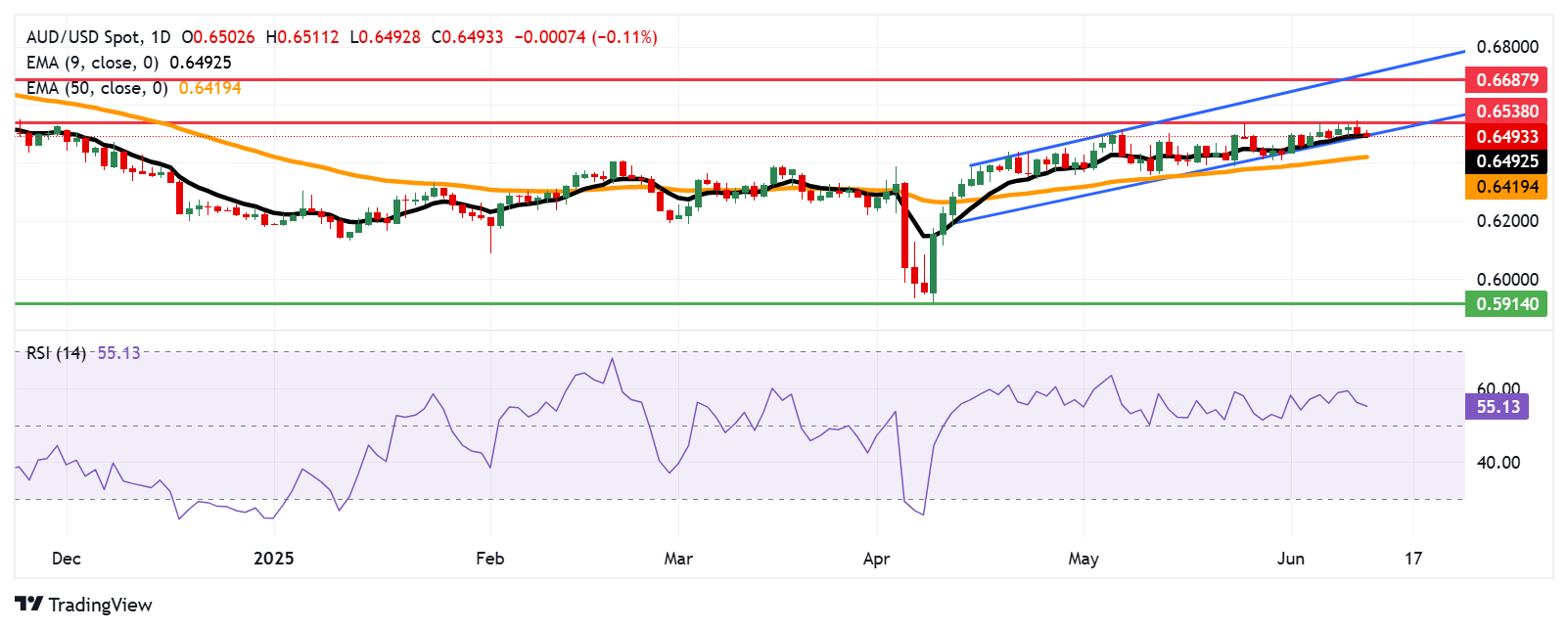 周二,澳元兑美元(AUD/USD)在0.6500附近交易。日线图的技术分析表明,随着该货币对试图突破上升通道的下边界,看涨偏见可能减弱。此外,该货币对略高于九日指数移动平均线(EMA);突破下方将削弱短期价格动量。然而,14日相对强弱指数(RSI)保持在50上方,表明存在看涨偏见。