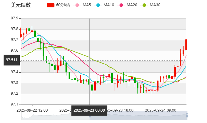 周三(9月24日)亚盘早盘,美元指数最新价报97.35,涨幅0.12%,开盘价为97.23。美债收益率的初步企稳为美元带来潜在支撑,但美元指数在短期内仍受制于前期高点阻力,呈现震荡回落态势。