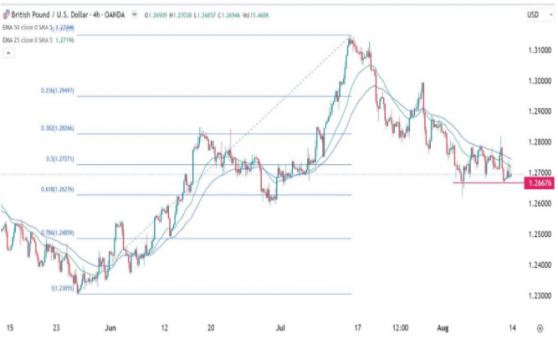 英镑兑美元货币对在7月份触及峰值1.3140之后一直处于看跌趋势。仍低于25日和50日移动均线以及50%斐波那契回撤位。该货币对在8月3日最低点1.2667找到强劲支撑。
