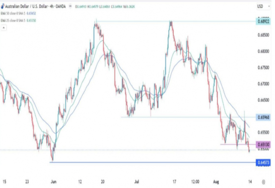 澳元兑美元在7月14日确认双顶形态后,一直处于强劲的看跌趋势中。它突破了该形态的颈线,并于上周重新测试。上周五还跌破了重要支撑位0.6513(8月3日低点)。
