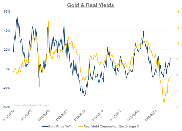 Yates写道:“对于影响金价的中短期基本面而言(主要是实际收益率和美元等因素),在经历了行业很妙的一年之后,黄金的前景仍然有些复杂。虽然实际收益率似乎越来越有可能接近本轮周期的峰值,尽管它们不太可能在不久的将来回到负值区域(这更有可能发生在2024年),但过去两年多来一直抑制金价上涨的实际收益率遭遇逆风,正在达到顶峰。”
