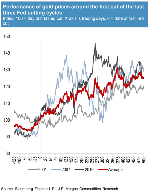 图2:最近3次美联储降息周期的首次降息发生时金价的表现