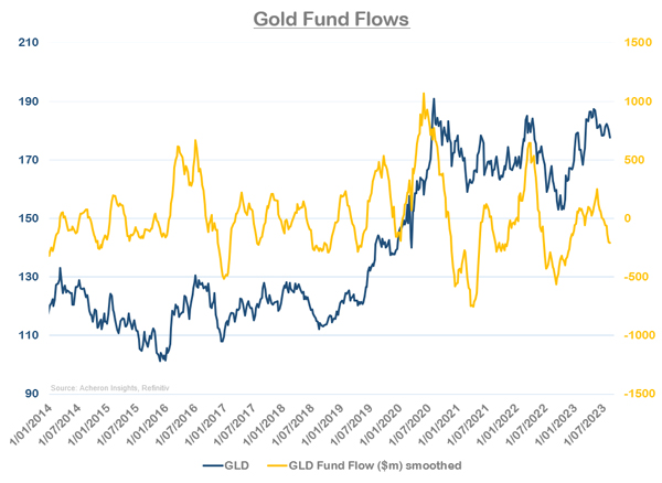 他说人气对黄金来说更令人鼓舞一些。他表示:“金价最近在鲜有宣传或媒体报道的情况下测试历史高点,这绝对是利好消息。事实上,如果我们通过黄金ETF流入资金等指标来评估市场情绪,我们可以看到,最近的高点实际上只伴随着一般的资金流入。这表明,贵金属市场远没有表现出大多数市场顶部那种明显的投机狂热,而这次回调也导致黄金ETF出现大量资金外流,这一事实也极大地鼓舞了黄金中期前景。”