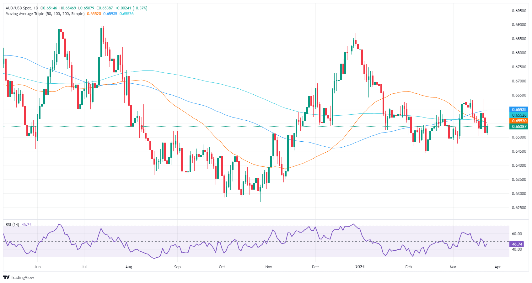 澳元(AUD) 在周一强劲上涨 0.41% 后,亚洲时段开盘兑美元汇率几乎没有变化。截至撰写本文时,澳元/美元交易价格为 0.6539,低于 200 日移动平均线 (DMA)。