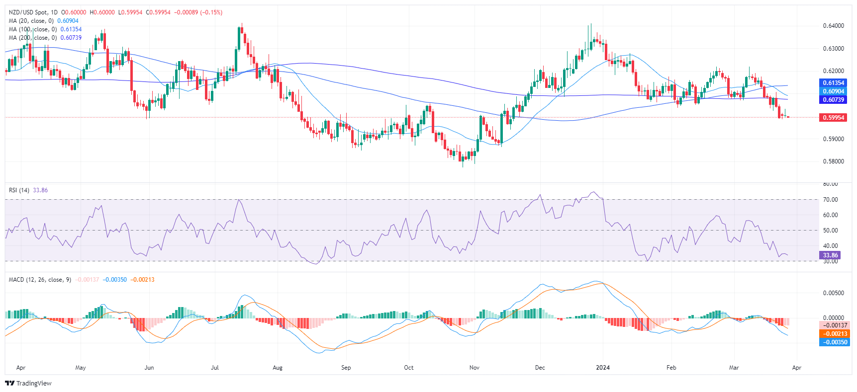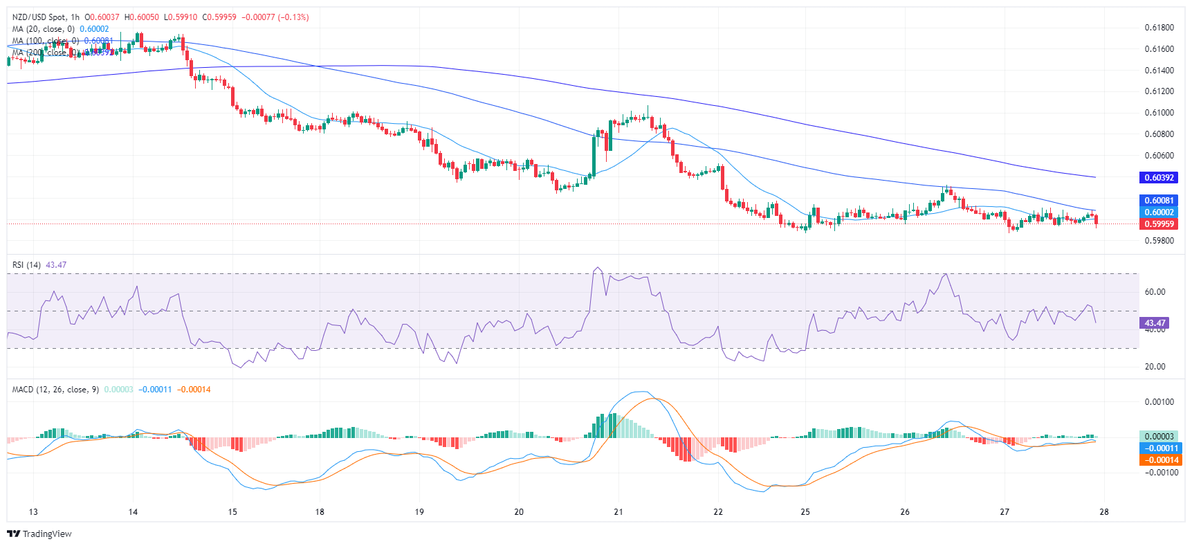 纽元/美元汇率在 0.6000 附近运行,出现亏损,市场格局主要由卖家主导,普遍的负面趋势凸显了这一点。该货币对位于重要的 20、100 和 200 日简单移动平均线 (SMA) 下方,强调了卖方的强劲存在。然而,小时图有潜在的短期看涨逆转的线索。