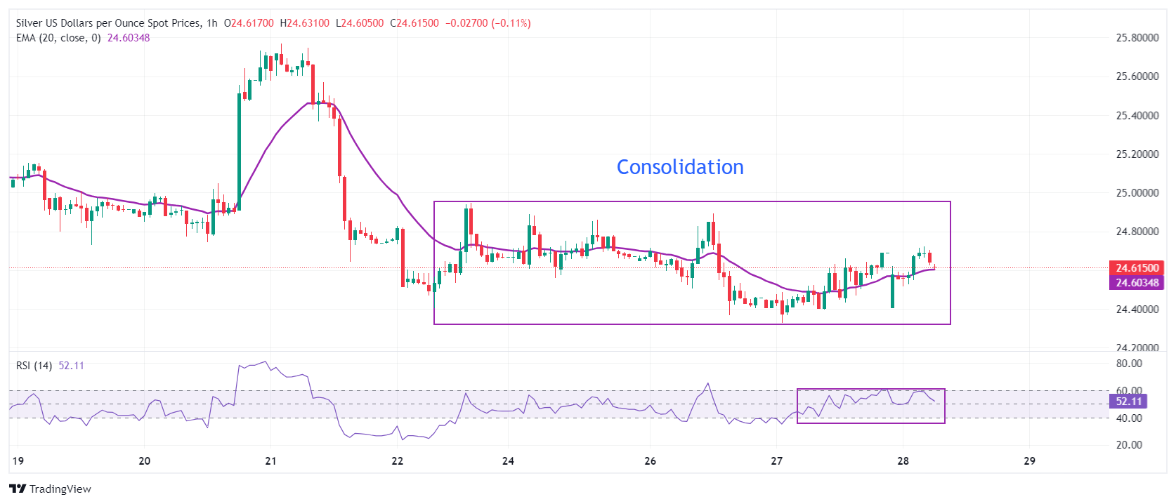 白银价格一周在 24.32 美元至 25.00 美元的范围内盘整。这表现出市场参与者的优柔寡断。20 周期指数移动平均线 (EMA) 为 24.60 美元,仍与现货价格保持一致,显示出横盘趋势。