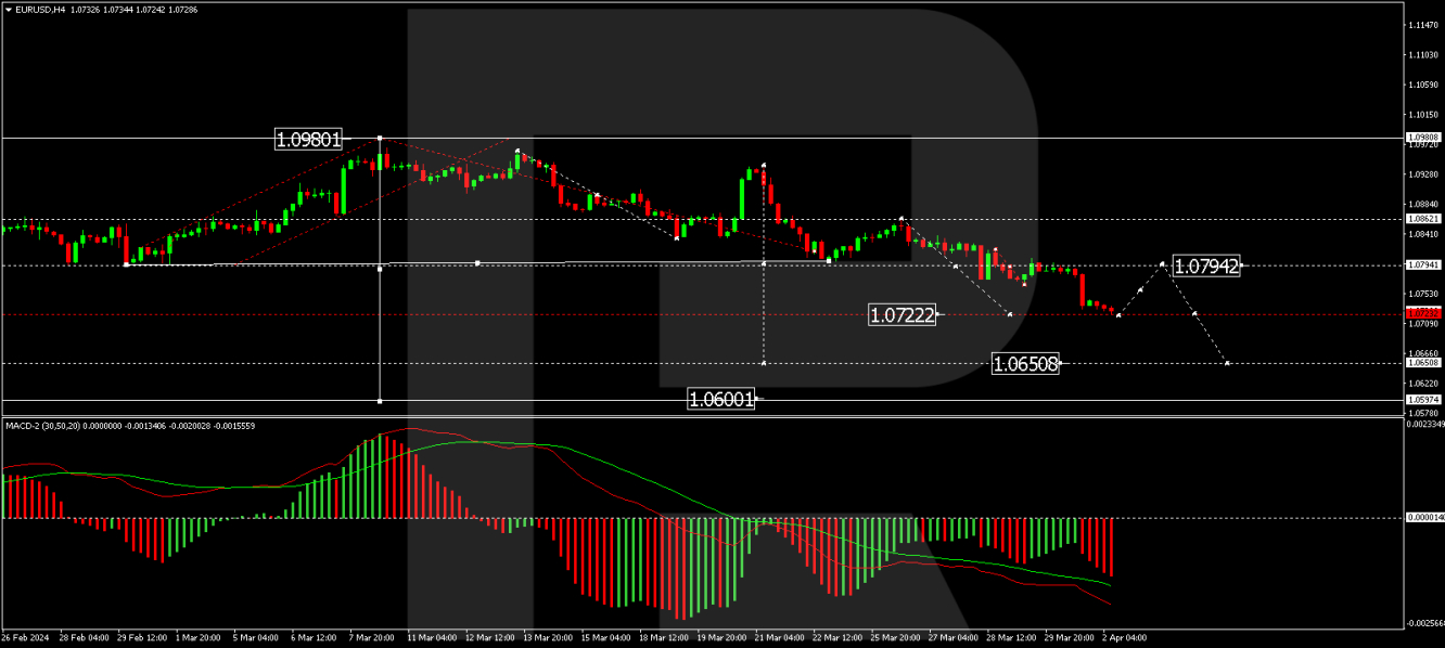 图表分析:欧元/美元货币对目前处于1.0794水平附近的盘整阶段。向下突破该区间可能导致持续跌向1.0650。随后可能会回调至 1.0794,并从下方进行测试,并有可能进一步跌至 1.0600。MACD 指标支持这种情况,该指标显示信号线低于零,表明持续下降趋势。