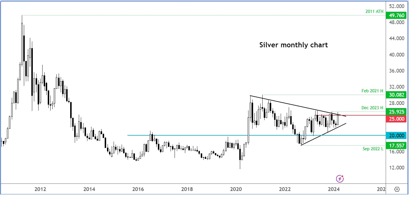 白银自2020年疫情高峰期短暂跌破20美元关键支撑位后大幅上涨以来,一直处于盘整阶段。