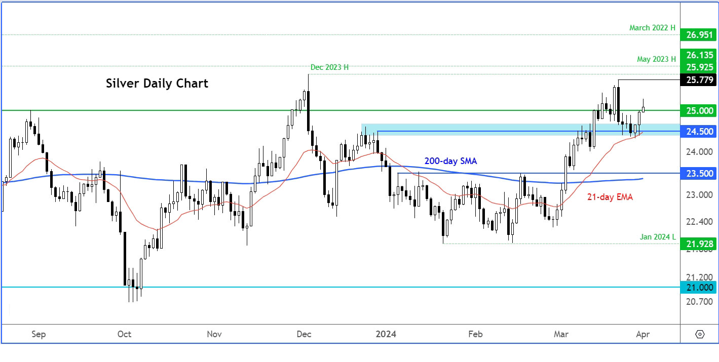 日线图上,您可以看到白银守住21日指数移动均线上方,该均线最近才突破200日移动均线,为我们提供了短期技术信号。