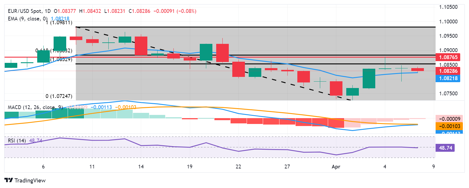 周一欧洲时间早盘时,欧元/美元的连胜率跌至接近1.083。这对选手可以向下移动,以测试1.0822时9天指数移动平均值(EMA)。