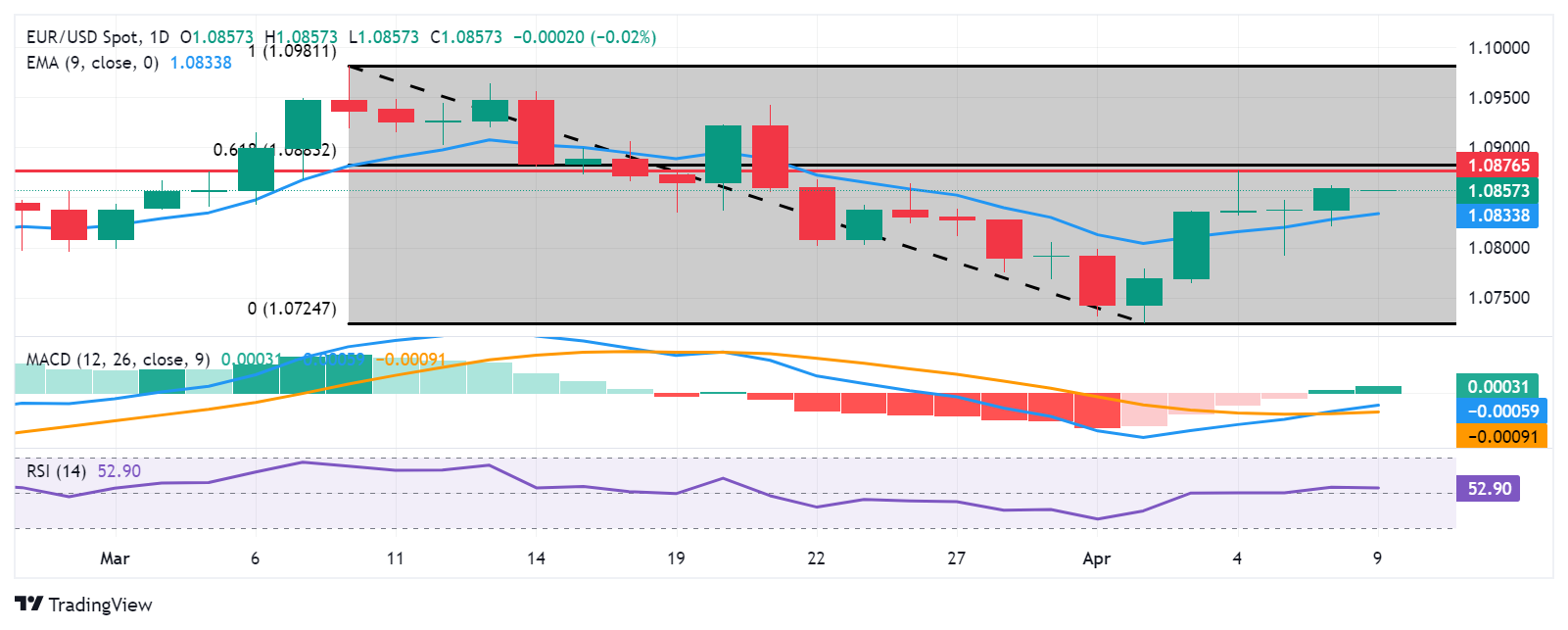 欧元/美元努力在周二的第六届会议上保持连胜。在亚洲会议期间,这对夫妇在1.0860左右徘徊。在每日框架中 图表 这对夫妇表示,他们正在接受9天指数移动平均值(EMA)的支持,这表明他们可以向上移动,以重新测试上周最高点1.0876的强劲阻力。
