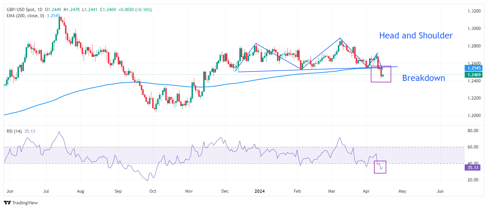 英镑在跌破 1.2500 心理支撑位后遭遇大幅抛售。英镑/美元货币对的长期趋势已转为看跌,因为其已跌破 200 日指数移动平均线 (EMA)(交易于 1.2570 附近)。