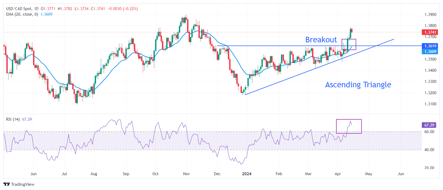 向上倾斜的 20 日指数移动平均线 (EMA) 接近 1.3610,表明未来还有更多上涨空间。