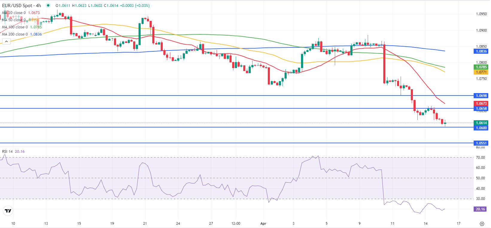 欧元/美元小幅走高,测试1.0600。4小时图上的相对强弱指数(RSI)指标保持在20附近,表明该货币对在技术上仍处于超卖状态。