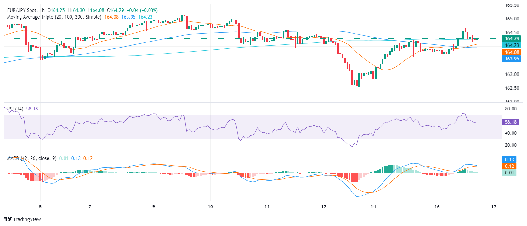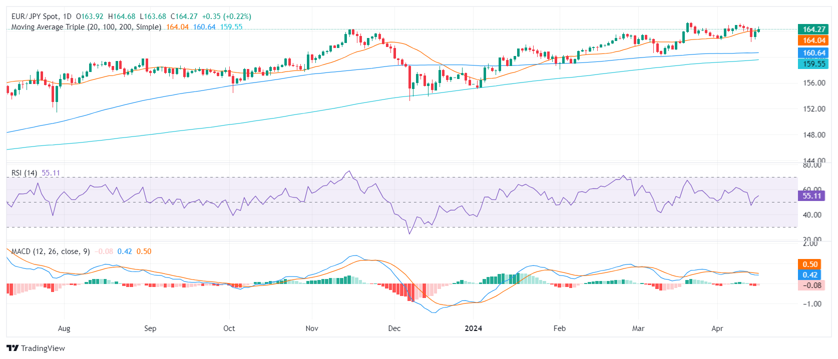 日线图显示,欧元/日元货币对保持看涨势头,其相对强弱指数 (RSI) 位于 55,轻松处于积极趋势区域。移动平均收敛散度 (MACD) 直方图红色条的下降支持了这一点,表明负面势头正在减弱。