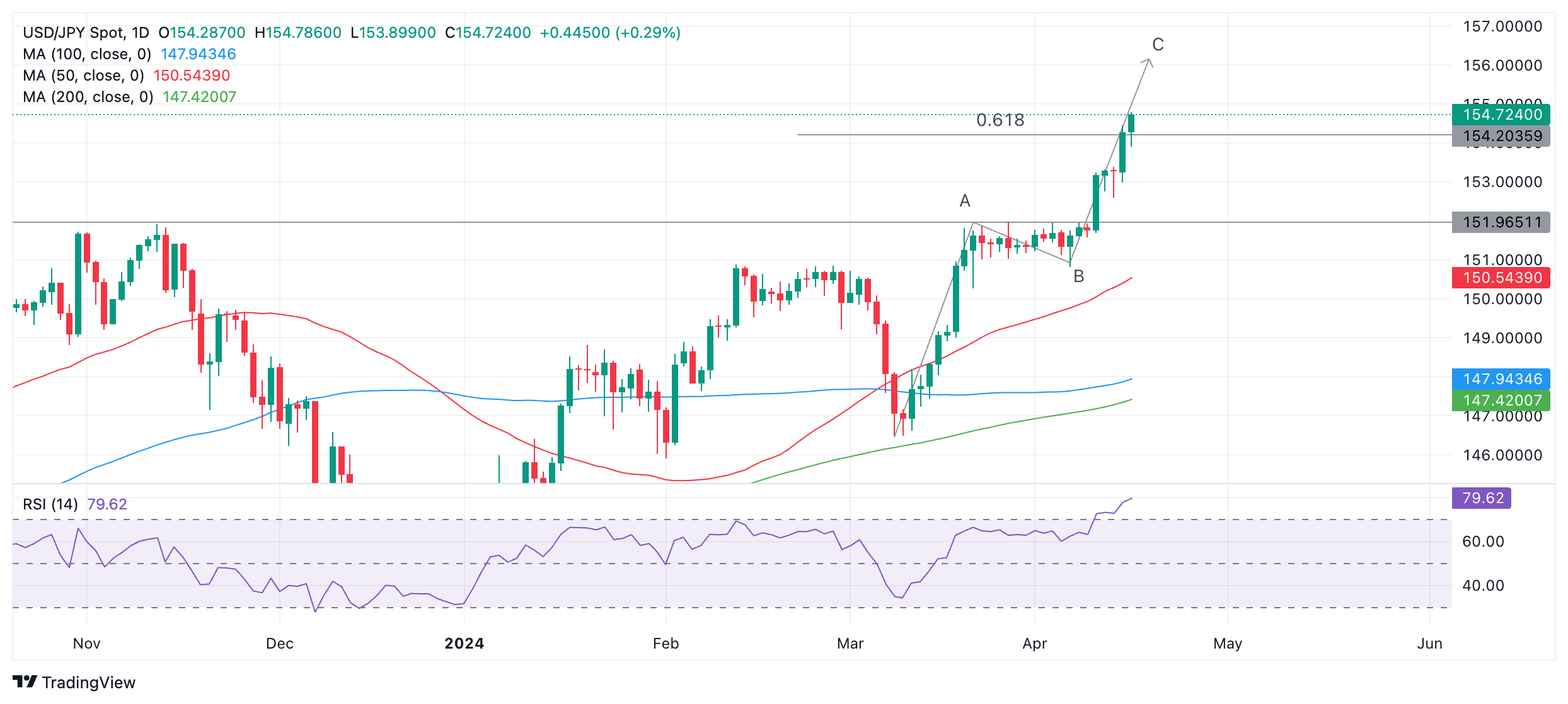 美元/日元交投于 154.00 上方。它形成了看起来像由三波组成的测量移动价格模式,通常标记为 A、B 和 C。